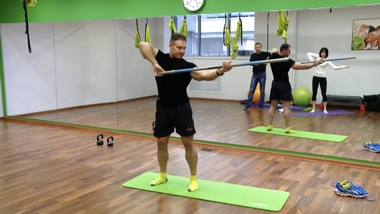 Лучше с деревянной палкой 1,5 м. Сначала лежит в руках обратным хватом, одна рука около конца держит. Проскальзываем как будто ударяем и выкручиваем ударяющую руку. Выкрутив оттягиваем кий назад. Затем в обратном порядке возвращаем в исходное положение.